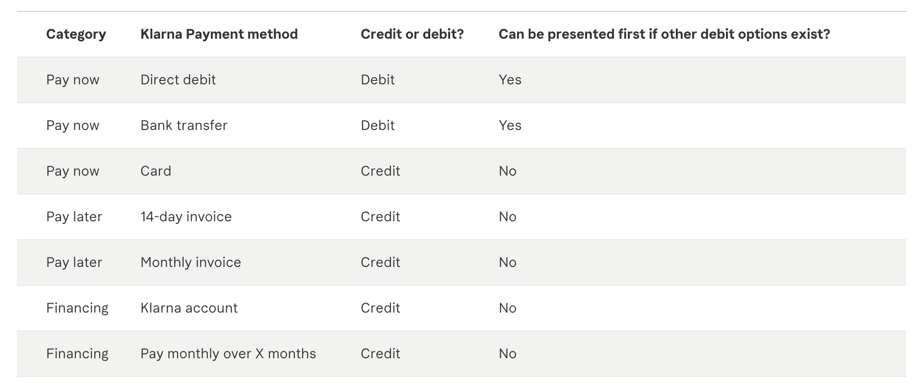 Below is an overview of Klarna payment methods, and how each categorizes in terms of credit or debit options.
