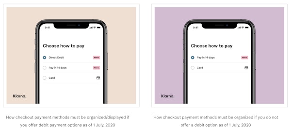 If you offer Klarna Payments in your checkout, Klarna cannot control the order or logic in which the payment methods are presented. Therefore, as a merchant you are solely responsible to ensure your checkout is compliant and lawful according to the new legislation before it enters into force (1 July 2020).